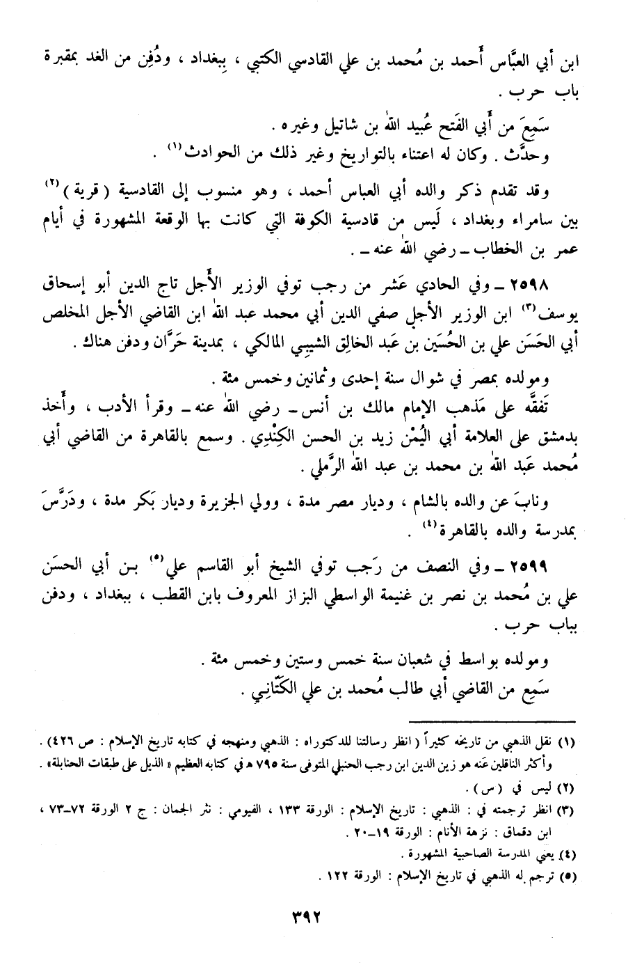 2599 - وفي النصف من رجب توفي الشيخ أبو القاسم علي بن أبي الحسن علي بن محمد بن نصر بن غنيمة الواسطي البزاز المعروف بابن القطب، ببغداد، ودفن بباب حرب.