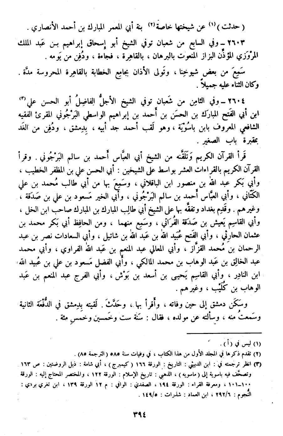 2604 - وفي الثامن من شعبان توفي الشيخ الأجل الفاضل أبو الحسن علي بن أبي الفتح المبارك بن الحسن بن أحمد بن إبراهيم الواسطي البرجوني المقرئ الفقيه الشافعي المعروف بابن باسوية، وهو لقب أحمد جد أبيه، بدمشق، ودفن من الغد بمقبرة باب الصغير.