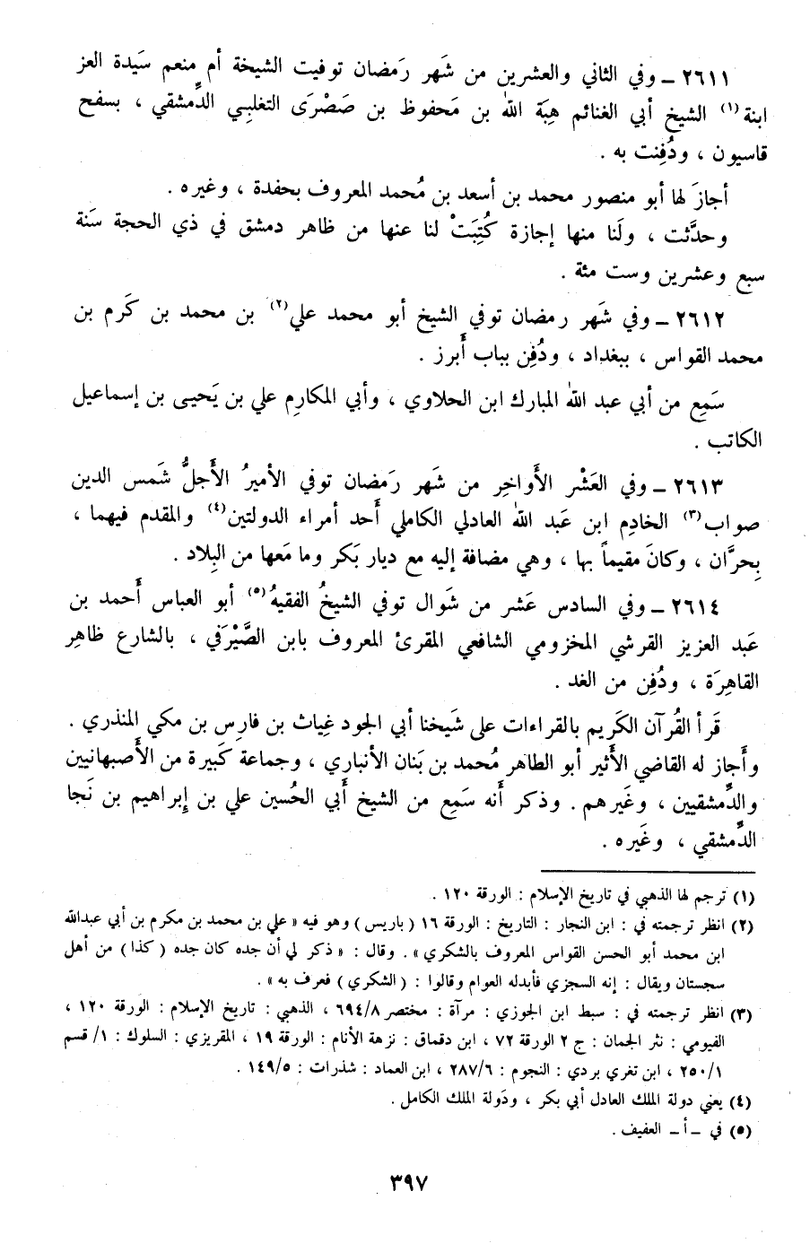 2611 - وفي الثاني والعشرين من شهر رمضان توفيت الشيخة أم منعم سيدة العز ابنة الشيخ أبي الغنائم هبة الله بن محفوظ بن صصرى التغلبي الدمشقي، بسفح قاسيون، ودفنت به.
