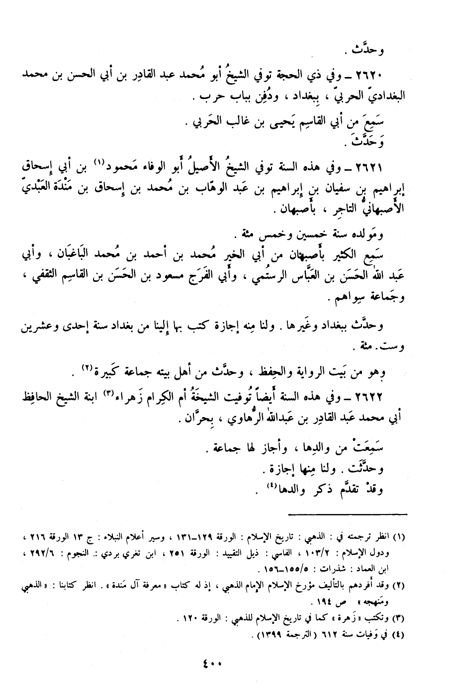 2620 - وفي ذي الحجة توفي الشيخ أبو محمد عبد القادر بن أبي الحسن بن محمد البغدادي الحربي، ببغداد، ودفن بباب حرب.