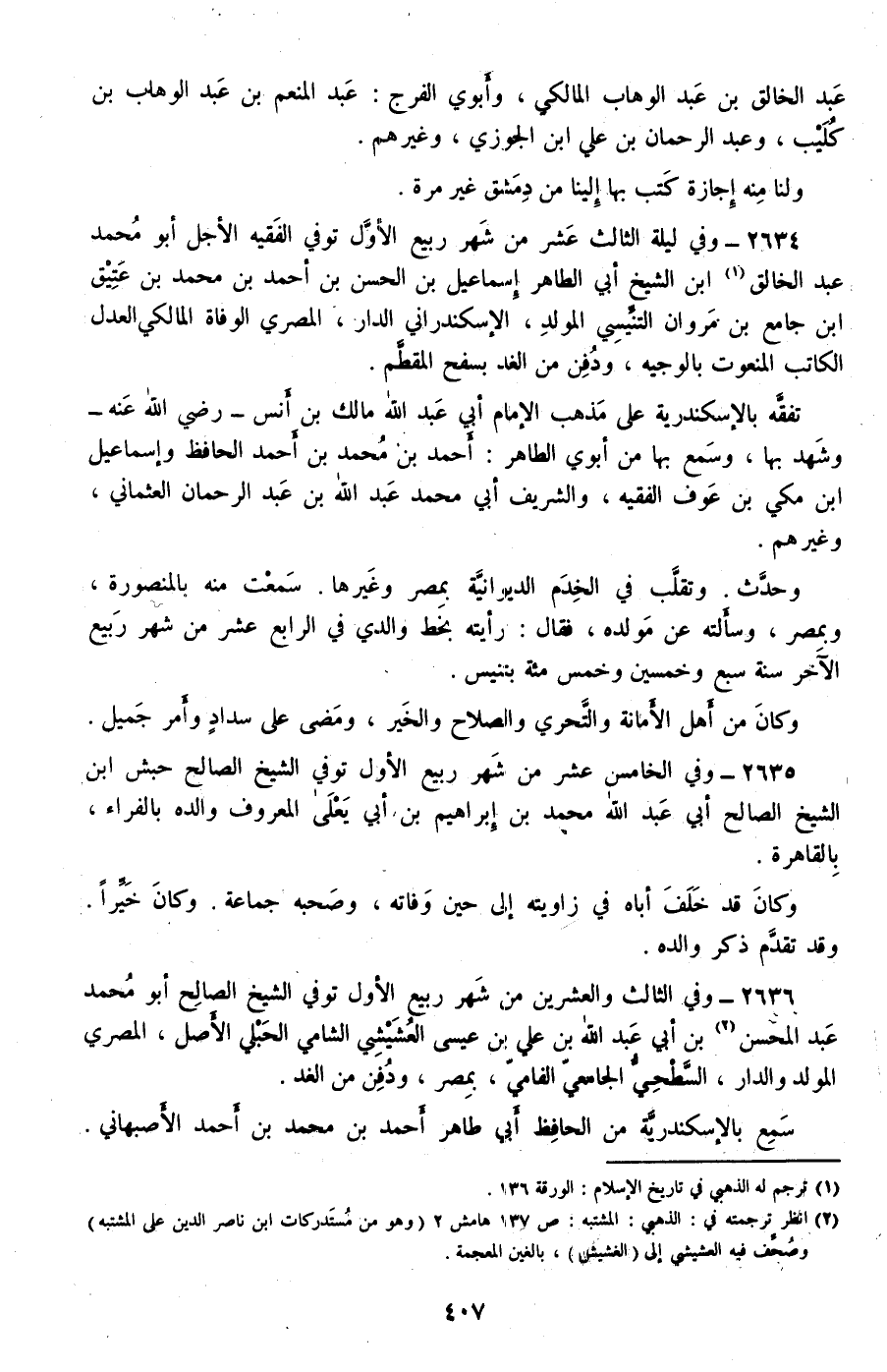 2634 - وفي ليلة الثالث عشر من شهر ربيع الأول توفي الفقيه الأجل أبو محمد عبد الخالق ابن الشيخ أبي الطاهر إسماعيل بن الحسن بن أحمد بن محمد بن عتيق بن جامع بن مروان التنيسي المولد، الإسكندراني الدار، المصري الوفاة المالكي العدل الكاتب المنعوت بالوجيه، ودفن من الغد بسفح المقطم.
