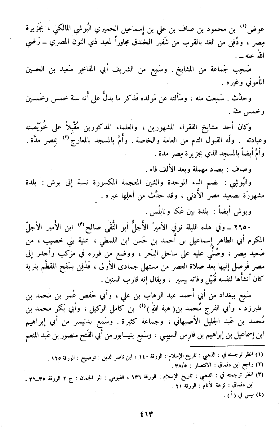 2650 - وفي هذه الليلة توفي الأمير الأجل أبو التقى صالح ابن الأمير الأجل المكرم أبي الطاهر إسماعيل بن أحمد بن حسن ابن اللمطي، بمنية بني خصيب، من صعيد مصر، وصلي عليه على ساحل البحر، ووضع من فوره في مركب وأحدر إلى مصر فوصل إليها بعد صلاة العصر من مستهل جمادى الأولى، فدفن بسفح المقطم بتربة كان أنشأها لنفسه قبيل وفاته بيسير، ويقال إنه قارب الستين.