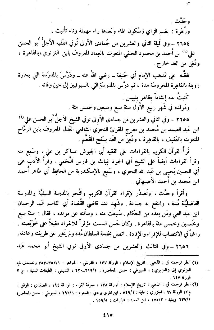 2654 - وفي ليلة الثاني والعشرين من جمادى الأولى توفي الفقيه الأجل أبو الحسن علي بن أحمد بن محمود الحنفي المنعوت بالعماد المعروف بابن الغزنوي، بالقاهرة، ودفن من الغد خارج.