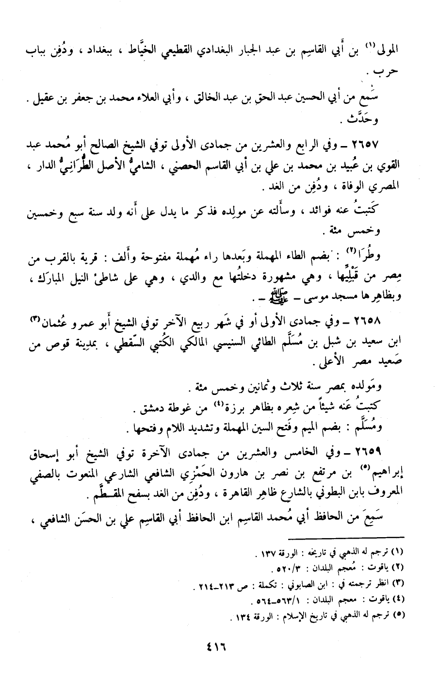 2659 - وفي الخامس والعشرين من جمادى الآخرة توفي الشيخ أبو إسحاق إبراهيم بن مرتفع بن نصر بن هارون الحمزي الشافعي الشارعي المنعوت بالصفي المعروف بابن البطوني، بالشارع ظاهر القاهرة، ودفن من الغد بسفح المقطم.