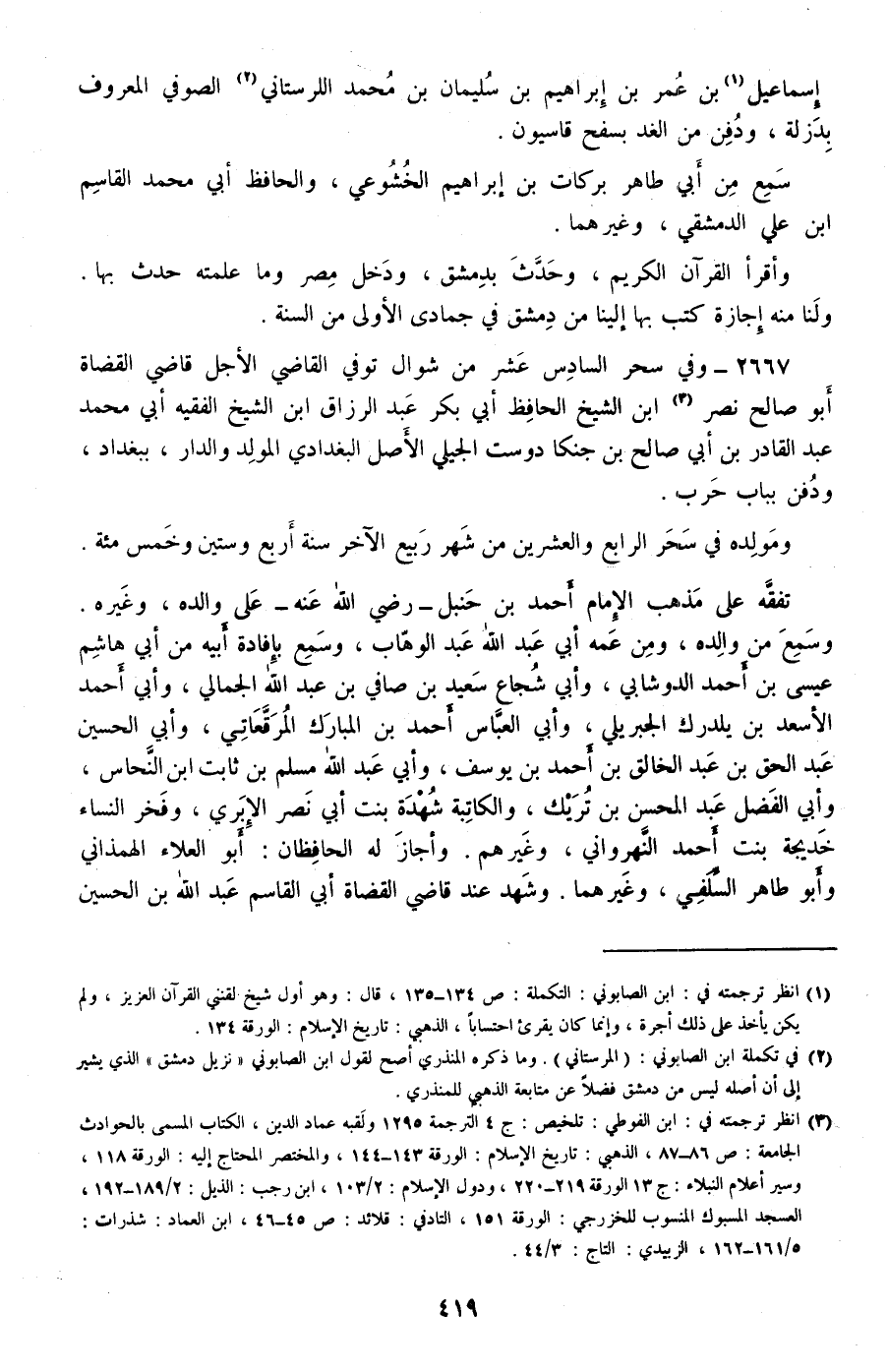 2667 - وفي سحر السادس عشر من شوال توفي القاضي الأجل قاضي القضاة أبو صالح نصر ابن الشيخ الحافظ أبي بكر عبد الرزاق ابن الشيخ الفقيه أبي محمد عبد القادر بن أبي صالح بن جنكا دوست الجيلي الأصل البغدادي المولد والدار، ببغداد، ودفن بباب حرب.