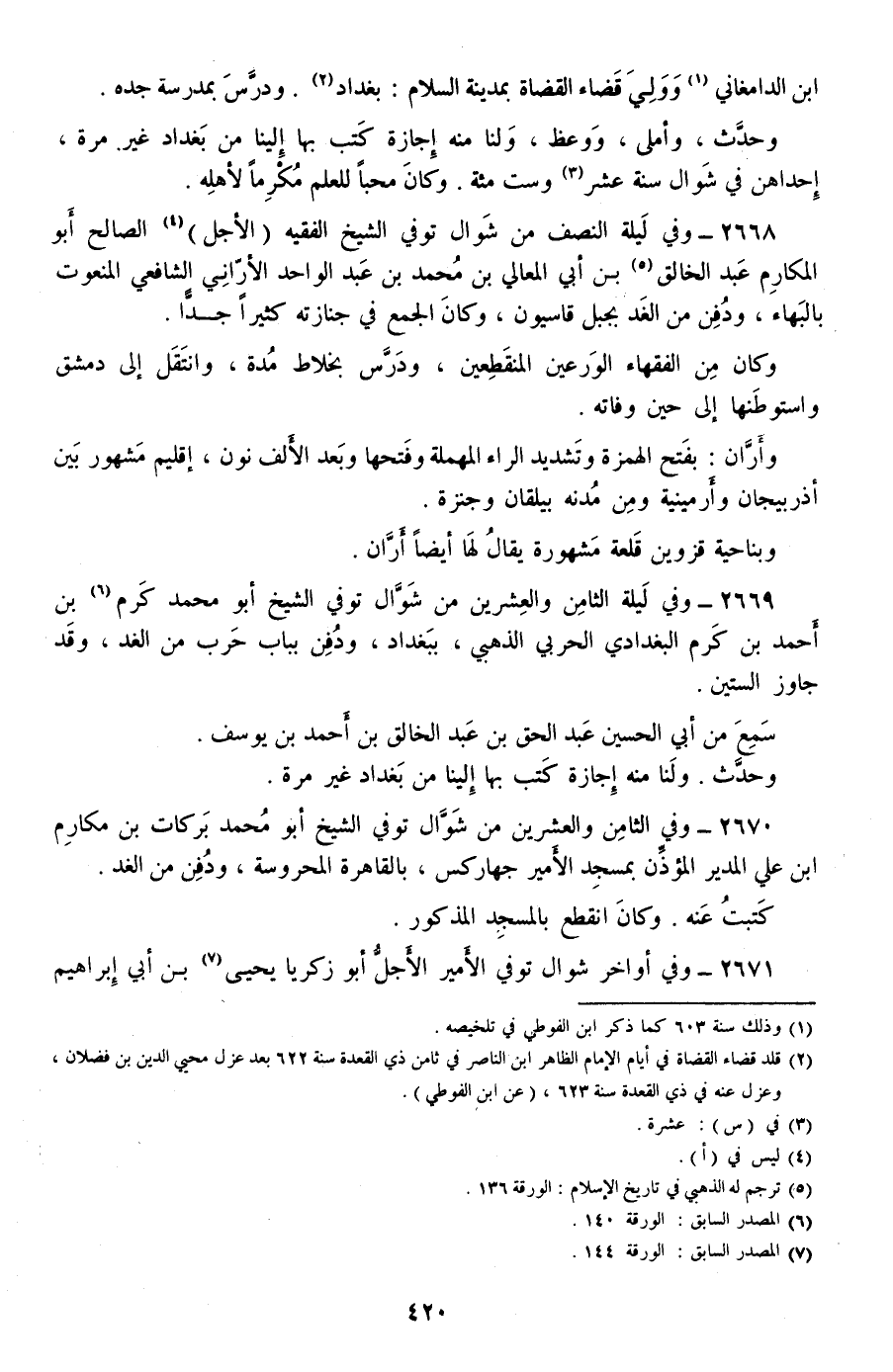 2668 - وفي ليلة النصف من شوال توفي الشيخ الفقيه (الأجل) الصالح أبو المكارم عبد الخالق بن أبي المعالي بن محمد بن عبد الواحد الأراني الشافعي المنعوت بالبهاء، ودفن من الغد بجبل قاسيون، وكان الجمع في جنازته كثيرا جدا.
