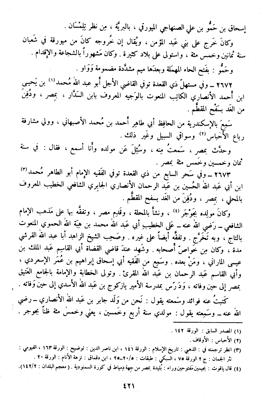 2673 - وفي سحر السابع من ذي القعدة توفي الفقيه الإمام أبو الطاهر محمد ابن أبي عبد الله الحسين بن عبد الرحمان الأنصاري الجابري الشافعي الخطيب المعروف بالمحلي، بمصر، ودفن من الغد بسفح المقطم.