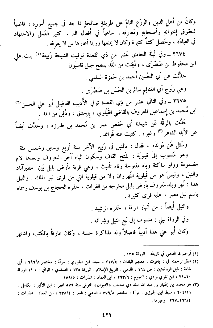 2675 - وفي الثاني عشر من ذي القعدة توفي الأديب الفاضل أبو علي الحسن بن محمد بن إسماعيل المعروف بالقاضي القيلوي، بدمشق، ودفن من الغد.