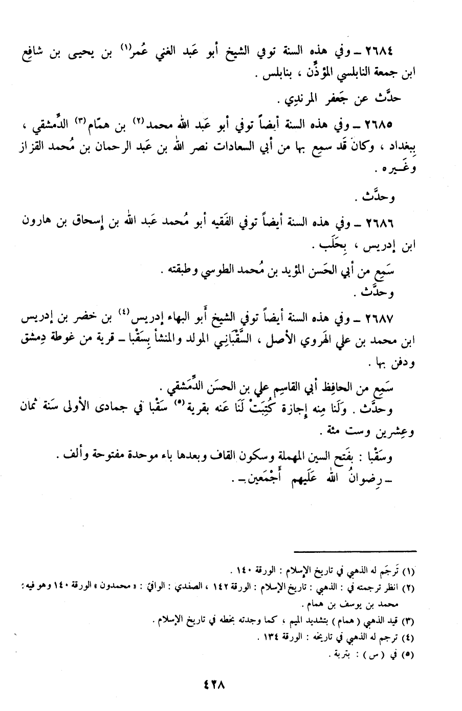 2685 - وفي هذه السنة أيضا توفي أبو عبد الله محمد بن همام الدمشقي، ببغداد، وكان قد سمع بها من أبي السعادات نصر الله بن عبد الرحمان بن محمد القزاز وغيره.