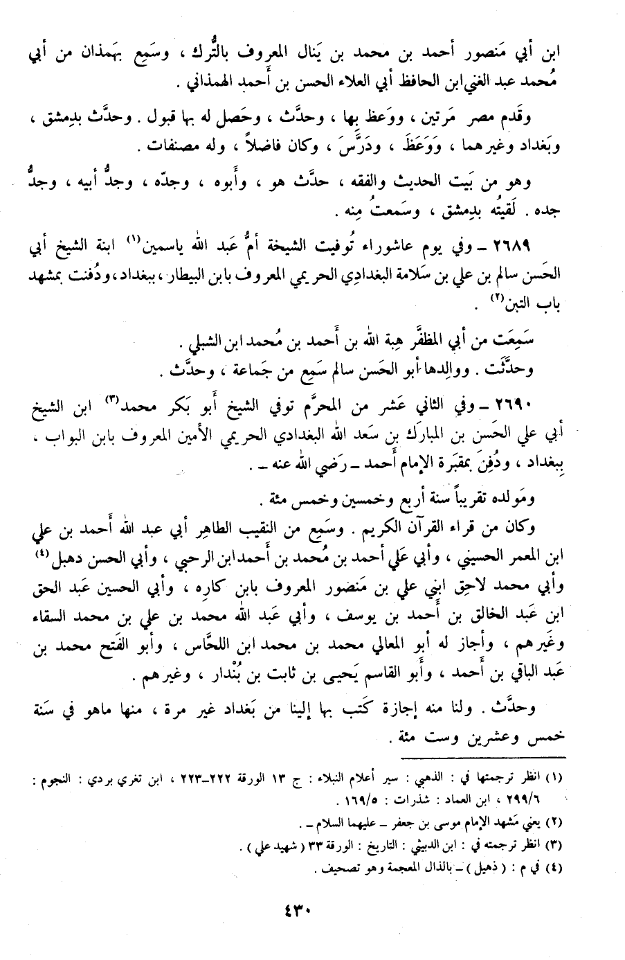 2690 - وفي الثاني عشر من المحرم توفي الشيخ أبو بكر محمد ابن الشيخ أبي علي الحسن بن المبارك بن سعد الله البغدادي الحريمي الأمين المعروف بابن البواب، ببغداد، ودفن بمقبرة الإمام أحمد -رضي الله عنه-.