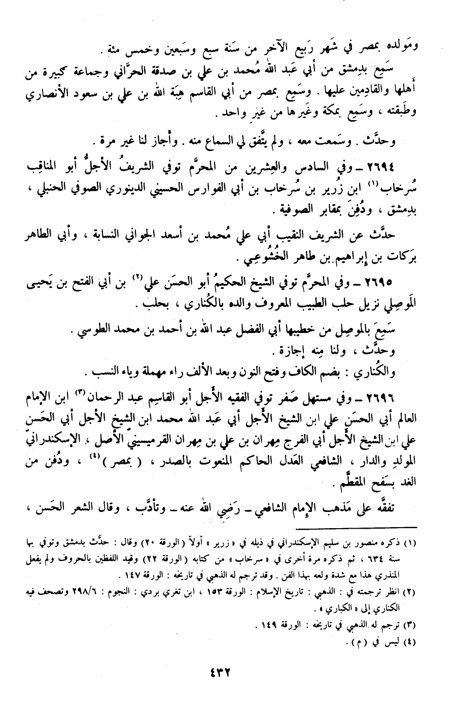 2694 - وفي السادس والعشرين من المحرم توفي الشريف الأجل أبو المناقب سرخاب بن زرير بن سرخاب بن أبي الفوارس الحسيني الدينوري الصوفي الحنبلي، بدمشق، ودفن بمقابر الصوفية.