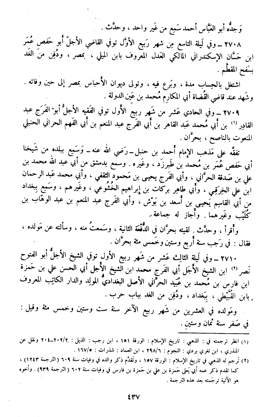 2709 - وفي الحادي عشر من شهر ربيع الأول توفي الفقيه الأجل أبو الفرج عبد القادر بن أبي محمد عبد القاهر بن أبي الفرج عبد المنعم بن أبي الفهم الحراني الحنبلي المنعوت بالناصح، بحران.