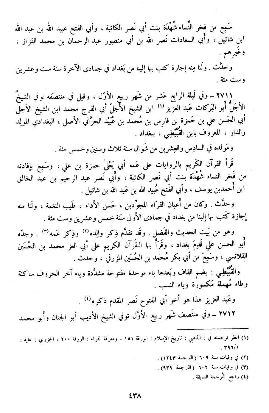2711 - وفي ليلة الرابع عشر من شهر ربيع الأول، وقيل في منتصفه توفي الشيخ الأجل أبو البركات عبد العزيز ابن الشيخ الأجل أبي الفرج محمد ابن الشيخ الأجل أبي الحسن علي بن حمزة بن فارس بن محمد بن عبيد الحراني الأصل، البغدادي المولد والدار، المعروف بابن القبيطي، ببغداد.