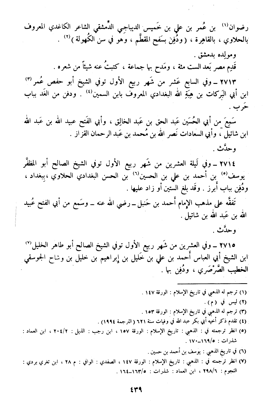 2713 - وفي السابع عشر من شهر ربيع الأول توفي الشيخ أبو حفص عمر بن أبي البركات بن هبة الله البغدادي المعروف بابن السمين. ودفن من الغد بباب حرب.