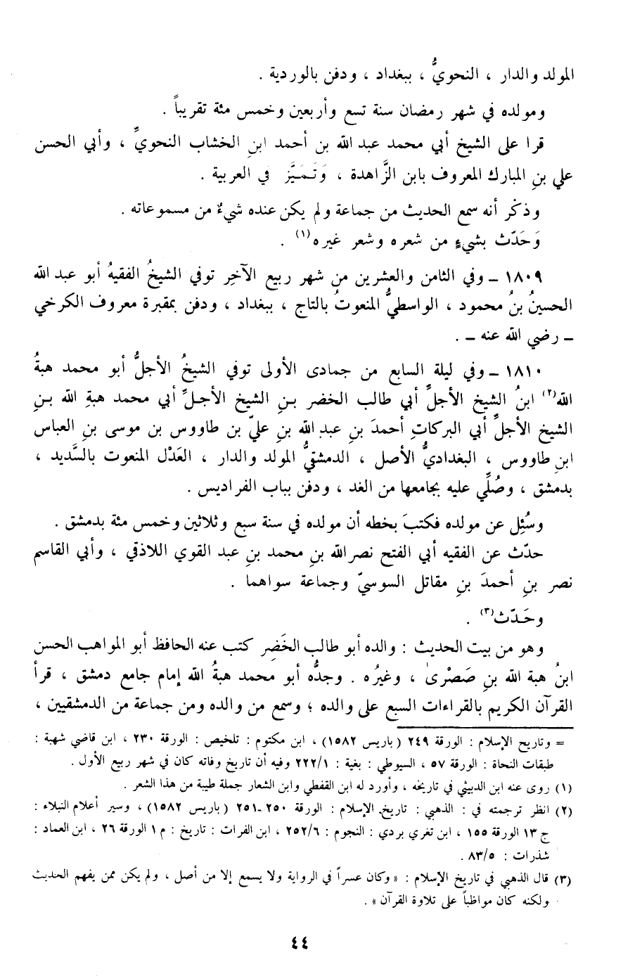 1810 - وفي ليلة السابع من جمادى الأولى توفي الشيخ الأجل أبو محمد هبة الله ابن الشيخ الأجل أبي طالب الخضر بن الشيخ الأجل أبي محمد هبة الله بن الشيخ الأجل أبي البركات أحمد بن عبد الله بن علي بن طاووس بن موسى بن العباس بن طاووس، البغدادي الأصل، الدمشقي المولد والدار، العدل المنعوت بالسديد، بدمشق، وصلي عليه بجامعها من الغد، ودفن بباب الفراديس.