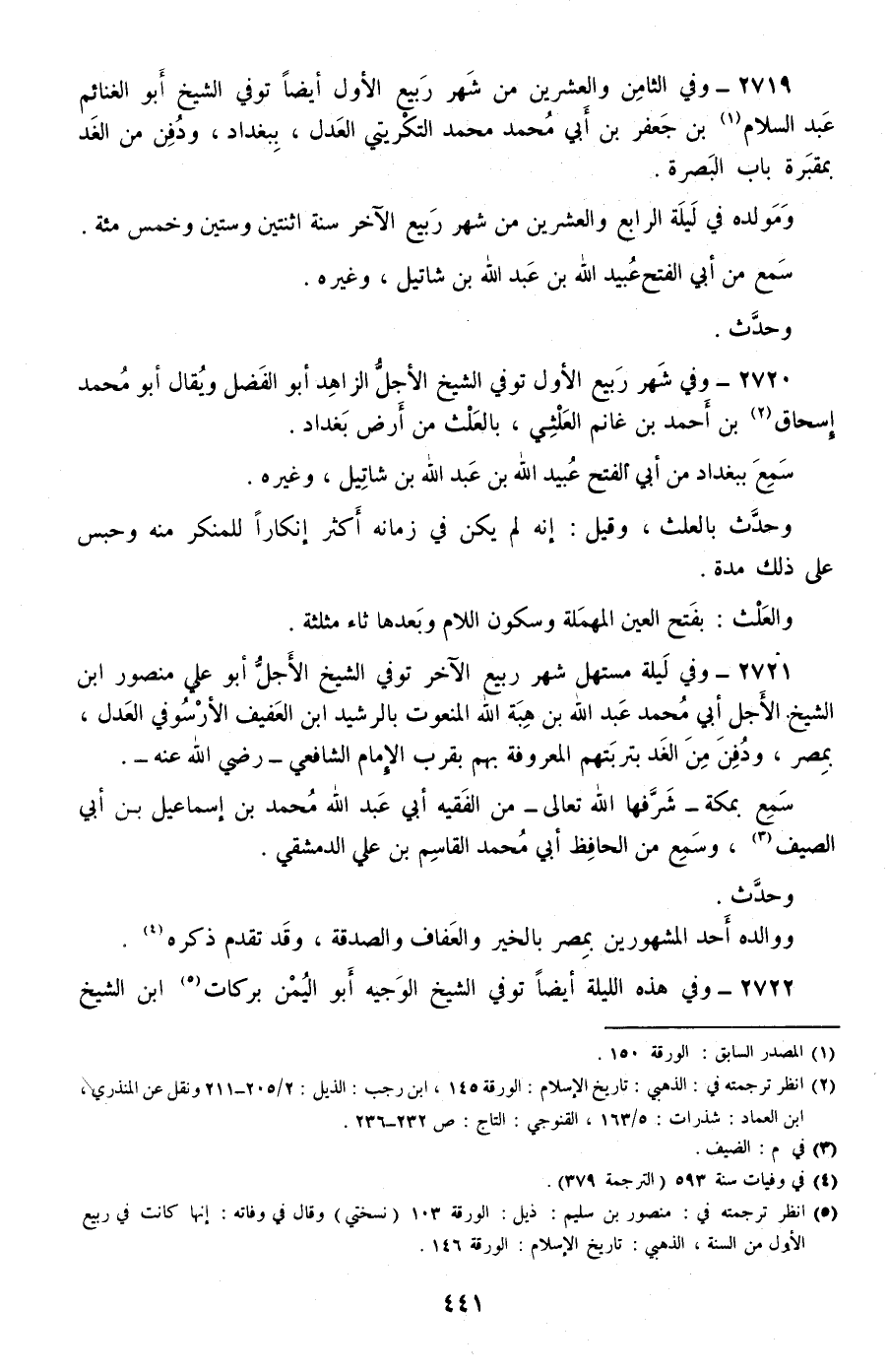 2719 - وفي الثامن والعشرين من شهر ربيع الأول أيضا توفي الشيخ أبو الغنائم عبد السلام بن جعفر بن أبي محمد محمد التكريتي العدل، ببغداد، ودفن من الغد بمقبرة باب البصرة.