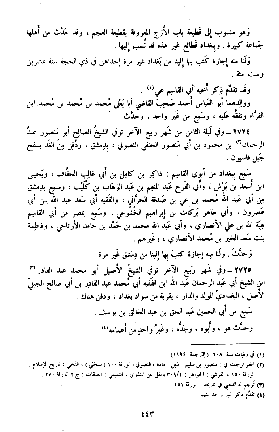 2725 - وفي شهر ربيع الآخر توفي الشيخ الأصيل أبو محمد عبد القادر ابن الشيخ عبد الرحمان عبد الله ابن الفقيه أبي محمد عبد القادر بن أبي صالح الجيلي الأصل، البغدادي المولد والدار، بقرية من سواد بغداد، ودفن هناك.