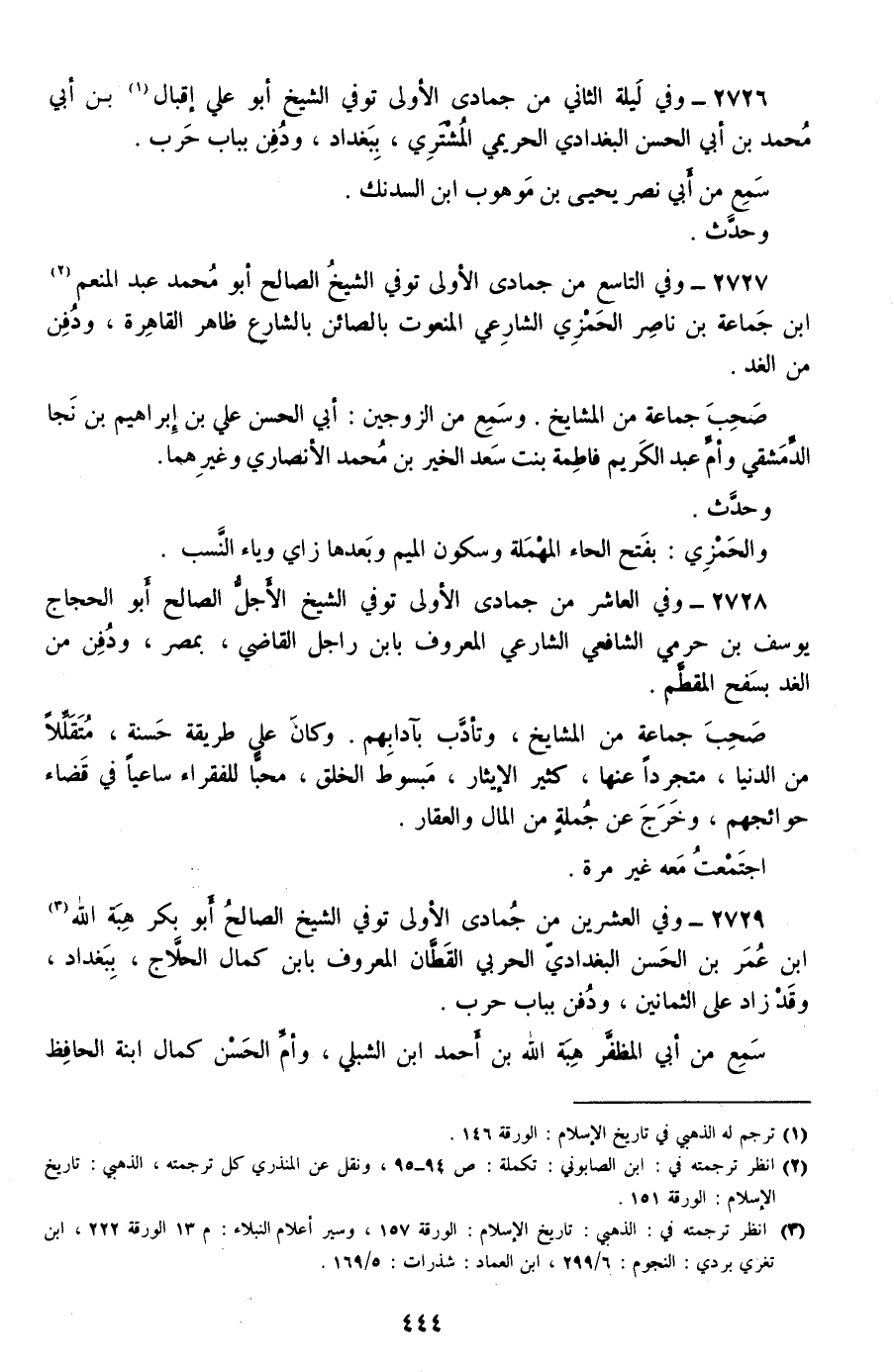 2729 - وفي العشرين من جمادى الأولى توفي الشيخ الصالح أبو بكر هبة الله بن عمر بن الحسن البغدادي الحربي القطان المعروف بابن كمال الحلاج، ببغداد، وقد زاد على الثمانين، ودفن بباب حرب.