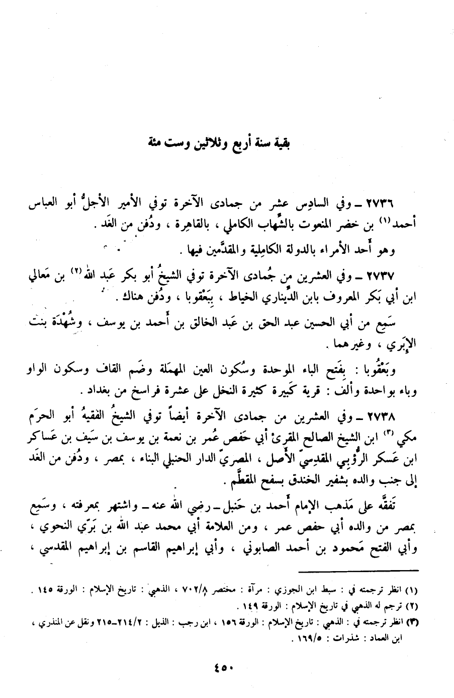 2737 - وفي العشرين من جمادى الآخرة توفي الشيخ أبو بكر عبد الله بن معالي بن أبي بكر المعروف بابن الديناري الخياط، ببعقوبا، ودفن هناك.