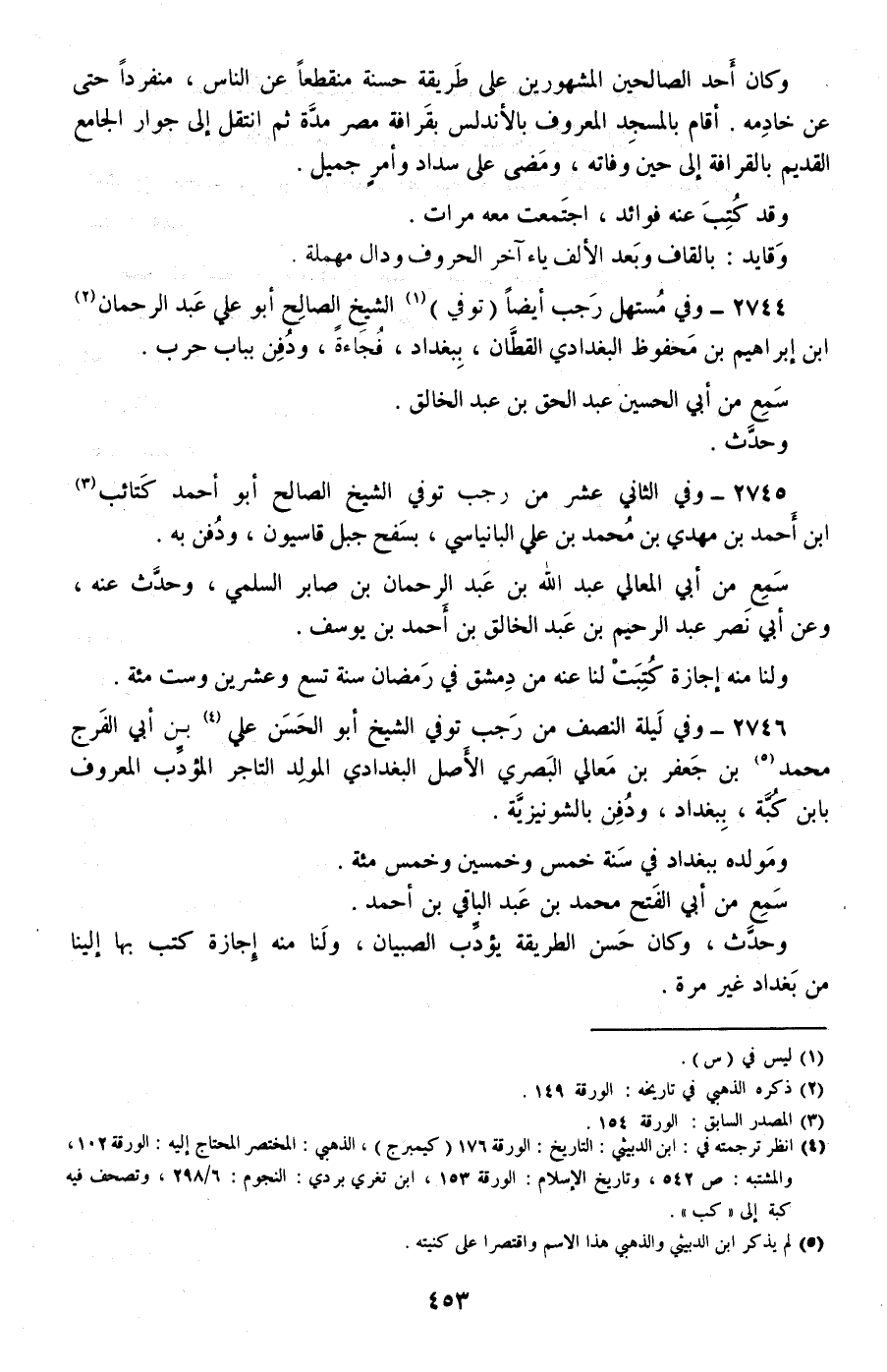 2744 - وفي مستهل رجب أيضا (توفي) الشيخ الصالح أبو علي عبد الرحمان بن إبراهيم بن محفوظ البغدادي القطان، ببغداد، فجاءة، ودفن بباب حرب.
