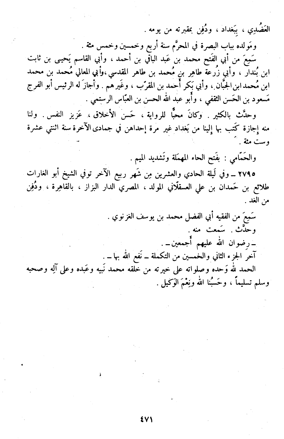 2795 - وفي ليلة الحادي والعشرين من شهر ربيع الآخر توفي الشيخ أبو الغارات طلائع بن حمدان بن علي العسقلاني المولد، المصري الدار البزاز، بالقاهرة، ودفن من الغد.