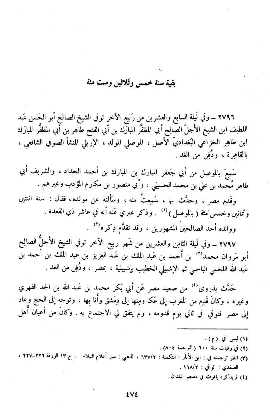 2797 - وفي ليلة الثامن والعشرين من شهر ربيع الآخر توفي الشيخ الأجل الصالح أبو مروان محمد بن أحمد بن عبد الملك بن عبد العزيز بن عبد الملك بن أحمد بن عبد الله اللخمي الباجي ثم الإشبيلي الخطيب بإشبيلية، بمصر، ودفن من الغد.