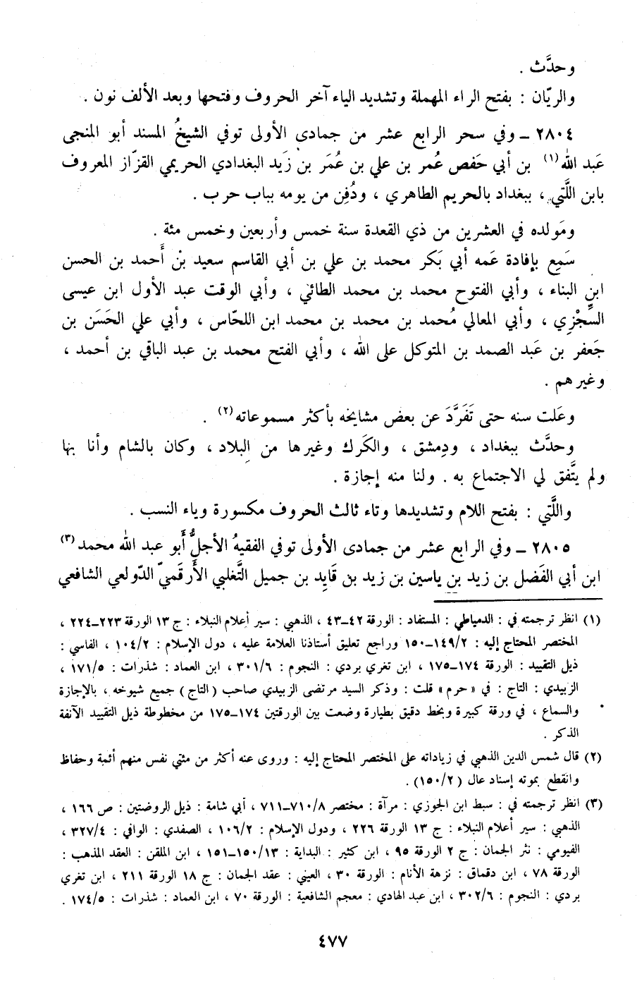 2804 - وفي سحر الرابع عشر من جمادى الأولى توفي الشيخ المسند أبو المنجى عبد الله بن أبي حفص عمر بن علي بن عمر بن زيد البغدادي الحريمي القزاز المعروف بابن اللتي، ببغداد بالحريم الطاهري، ودفن من يومه بباب حرب.