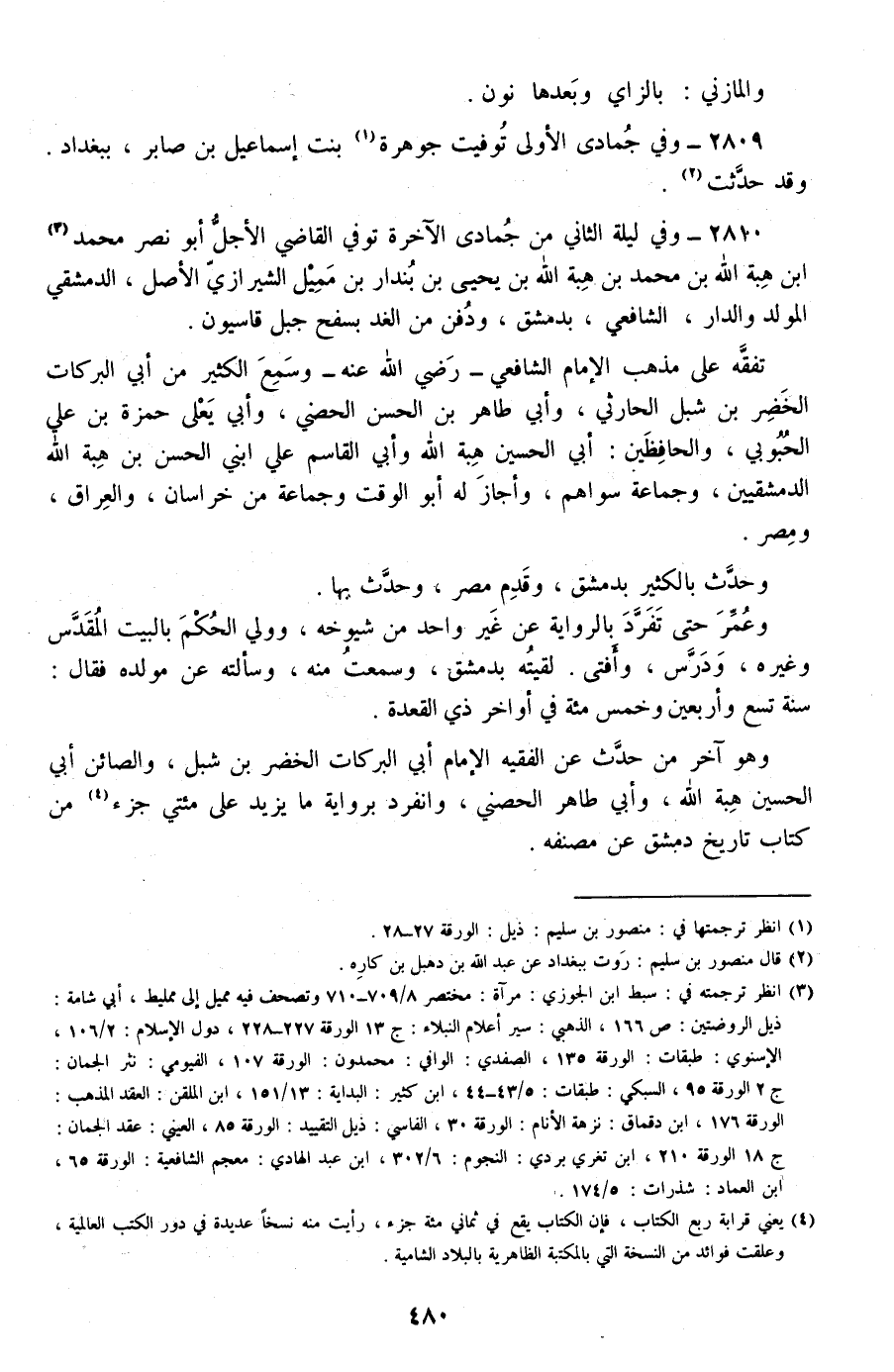 2810 - وفي ليلة الثاني من جمادى الآخرة توفي القاضي الأجل أبو نصر محمد بن هبة الله بن محمد بن هبة الله بن يحيى بن بندار بن مميل الشيرازي الأصل، الدمشقي المولد والدار، الشافعي، بدمشق، ودفن من الغد بسفح جبل قاسيون.
