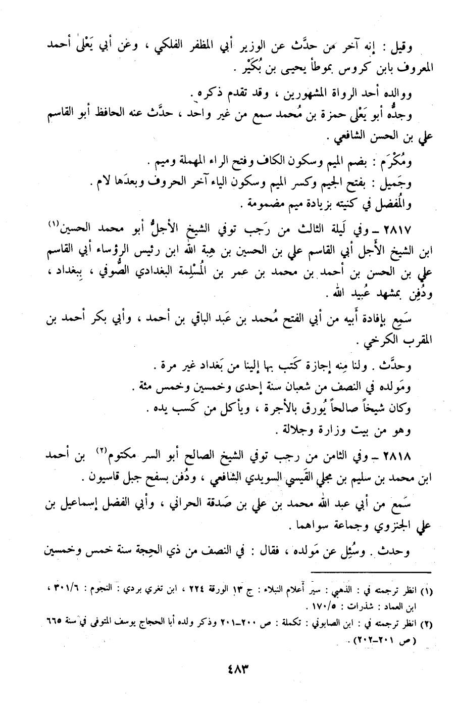 2817 - وفي ليلة الثالث من رجب توفي الشيخ الأجل أبو محمد الحسين ابن الشيخ الأجل أبي القاسم علي بن الحسين بن هبة الله ابن رئيس الرؤساء أبي القاسم علي بن الحسن بن أحمد بن محمد بن عمر بن المسلمة البغدادي الصوفي، ببغداد ودفن بمشهد عبيد الله.