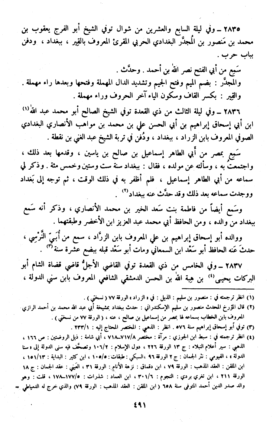 2835 - وفي ليلة السابع والعشرين من شوال توفي الشيخ أبو الفرج يعقوب بن محمد بن منصور بن المجدر البغدادي الحربي المقرئ المعروف بالقير، ببغداد، ودفن بباب حرب.
