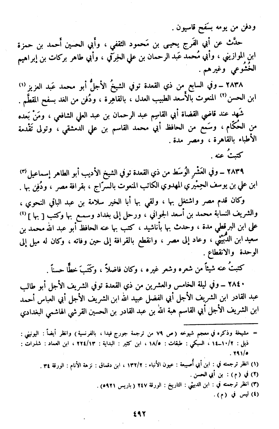 2840 - وفي ليلة الخامس والعشرين من ذي القعدة توفي الشريف الأجل أبو طالب عبد القادر ابن الشريف الأجل أبي الفضل عبيد الله ابن الشريف الأجل أبي العباس أحمد ابن الشريف الأجل أبي القاسم هبة الله بن عبد القادر بن الحسين القرشي الهاشمي البغدادي الخطيب المعروف بابن المنصوري، #493# ببغداد، ودفن بمقبرة باب البصرة.