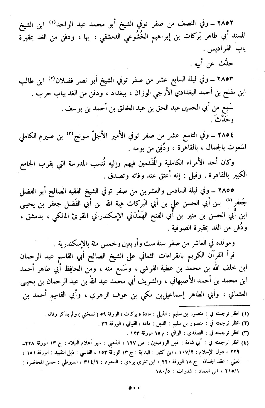 2852 - وفي النصف من صفر توفي الشيخ أبو محمد عبد الواحد ابن الشيخ المسند أبي طاهر بركات بن إبراهيم الخشوعي الدمشقي، بها، ودفن من الغد بمقبرة باب الفراديس.