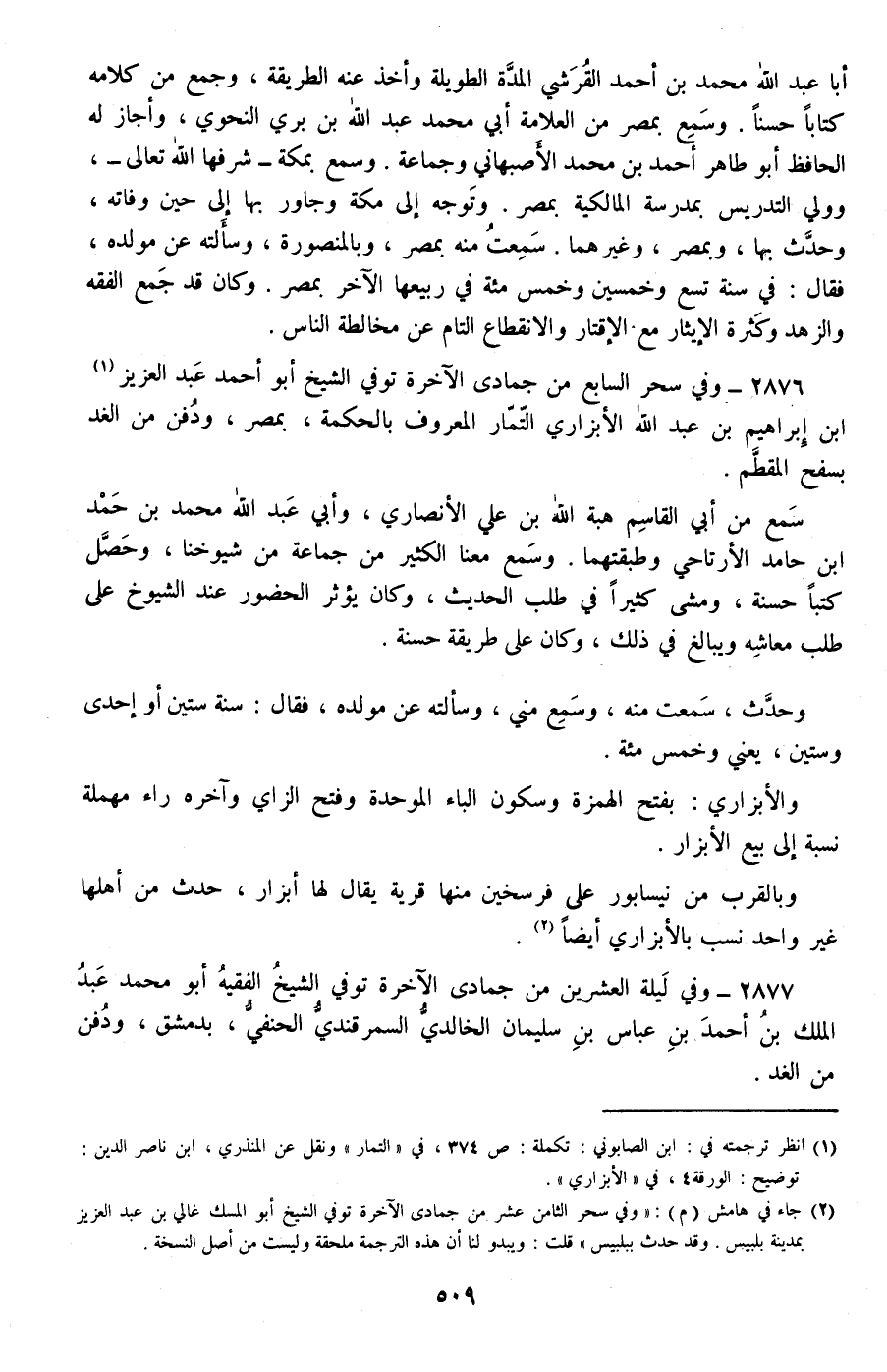 2876 - وفي سحر السابع من جمادى الآخرة توفي الشيخ أبو أحمد عبد العزيز بن إبراهيم بن عبد الله الأبزاري التمار المعروف بالحكمة، بمصر، ودفن من الغد بسفح المقطم.