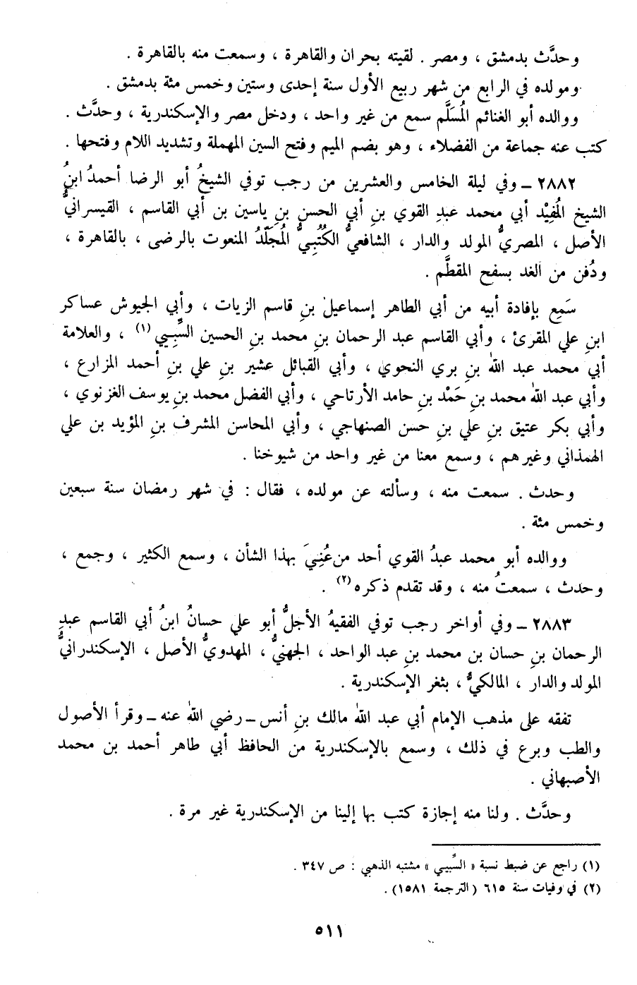 2883 - وفي أواخر رجب توفي الفقيه الأجل أبو علي حسان بن أبي القاسم عبد الرحمان بن حسان بن محمد بن عبد الواحد، الجهني، المهدوي الأصل، الإسكندراني المولد والدار، المالكي، بثغر الإسكندرية.