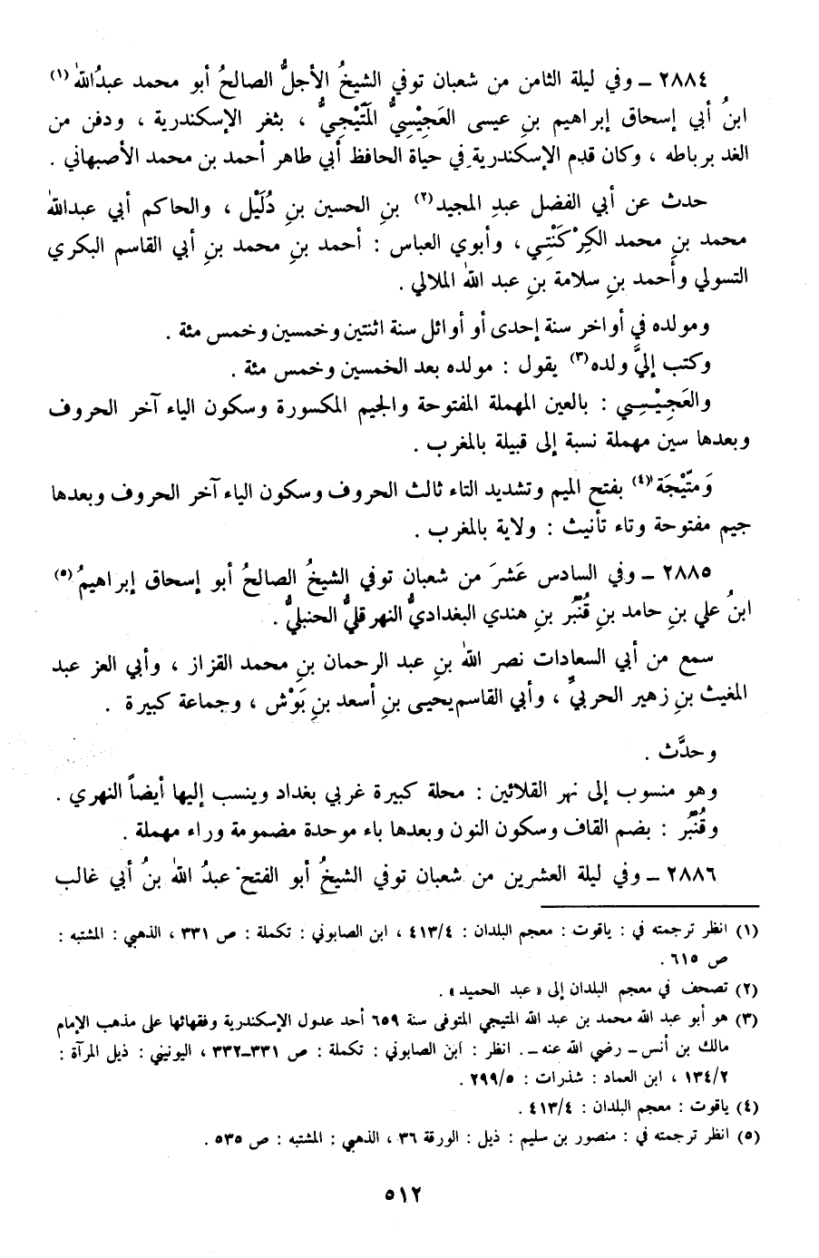 2884 - وفي ليلة الثامن من شعبان توفي الشيخ الأجل الصالح أبو محمد عبد الله بن أبي إسحاق إبراهيم بن عيسى العجيسي المتيجي، بثغر الإسكندرية، ودفن من الغد برباطه، وكان قدم الإسكندرية في حياة الحافظ أبي طاهر أحمد بن محمد الأصهباني.