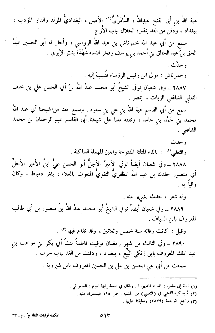 2889 - وفي شعبان أيضا توفي الشيخ أبو محمد عبد الله بن منصور بن أبي طالب المعروف بابن السياف