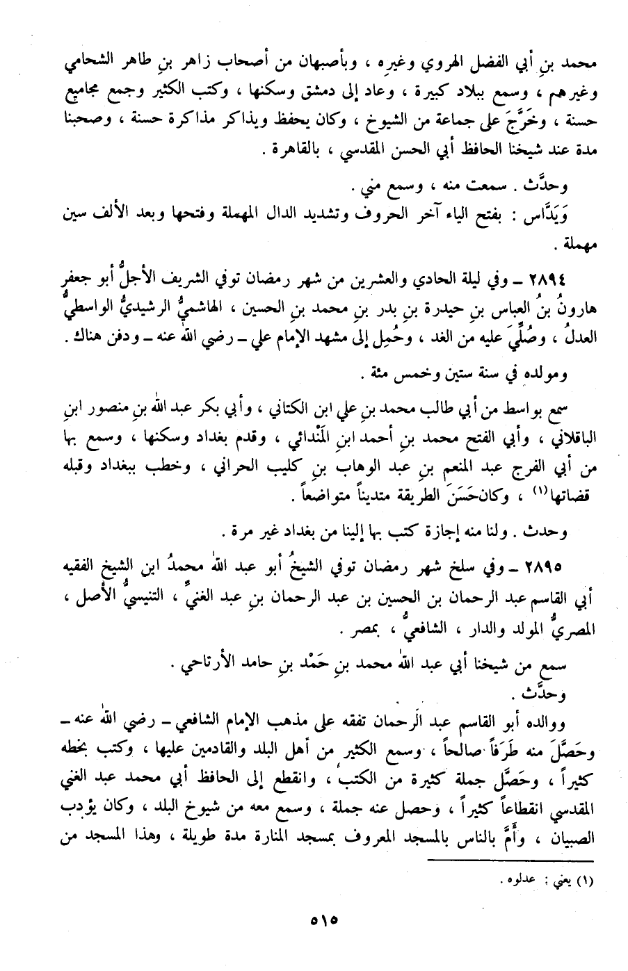 2895 - وفي سلخ شهر رمضان توفي الشيخ أبو عبد الله محمد ابن الشيخ الفقيه أبي القاسم عبد الرحمان بن الحسين بن عبد الرحمان بن عبد الغني، التنيسي الأصل، المصري المولد والدار، الشافعي، بمصر.