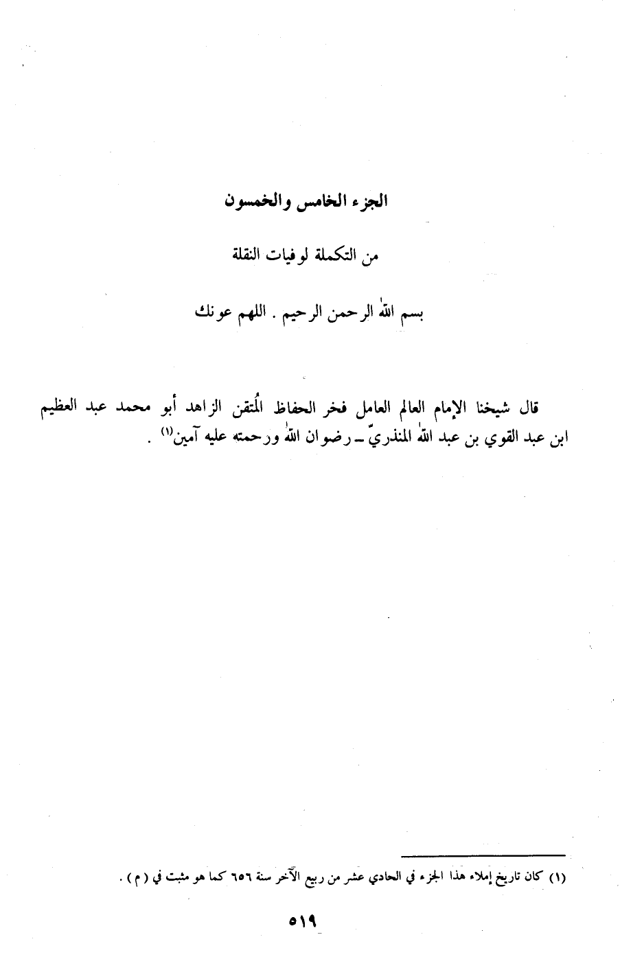قال شيخنا الإمام العالم العامل فخر الحفاظ المتقن الزاهد أبو محمد عبد العظيم بن عبد القوي بن عبد الله المنذري -رضوان الله ورحمته عليه آمين.