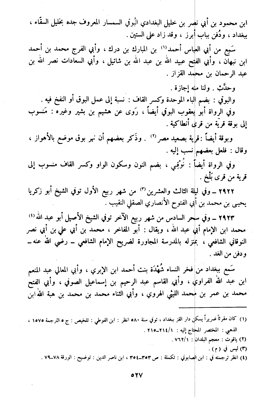 2923 - وفي سحر السادس من شهر ربيع الآخر توفي الشيخ الأصيل أبو عبد الله محمد ابن الإمام أبي عبد الله، ويقال: أبو المفاخر، محمد بن أبي علي بن أبي نصر النوقاني الشافعي، بمنزله بالمدرسة المجاورة لضريح الإمام الشافعي -رضي الله عنه- ودفن من الغد.