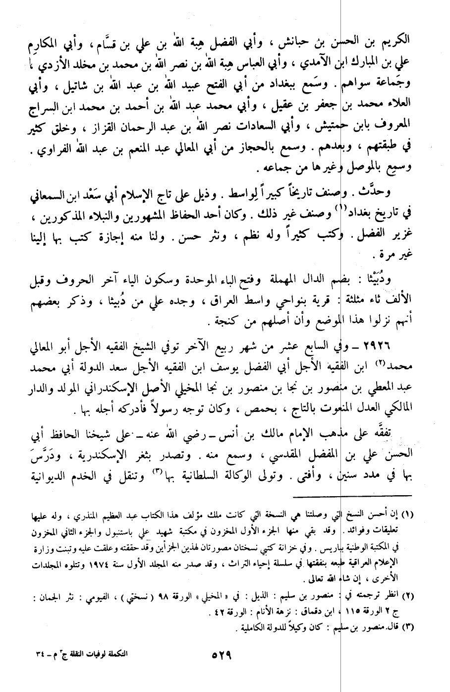 2926 - وفي السابع عشر من شهر ربيع الآخر توفي الشيخ الفقيه الأجل أبو المعالي محمد ابن الفقيه الأجل أبي الفضل يوسف ابن الفقيه الأجل سعد الدولة أبي محمد عبد المعطي بن منصور بن نجا بن منصور بن نجا المخيلي الأصل الإسكندراني المولد والدار المالكي العدل المنعوت بالتاج، بحمص، وكان توجه رسولا فأدركه أجله بها.