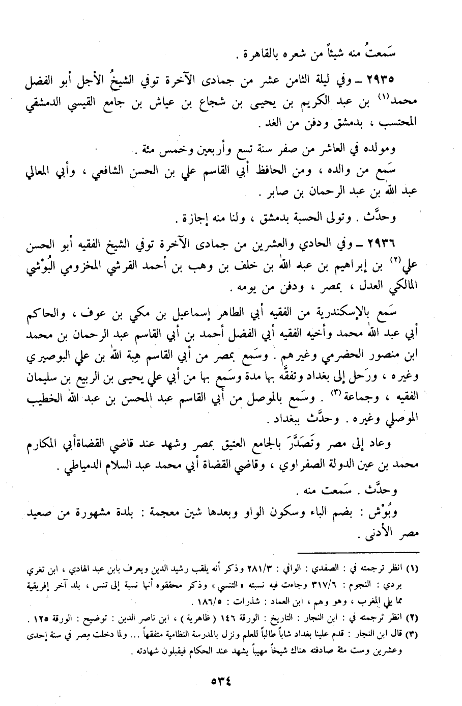 2935 - وفي ليلة الثامن عشر من جمادى الآخرة توفي الشيخ الأجل أبو الفضل محمد بن عبد الكريم بن يحيى بن شجاع بن عياش بن جامع القيسي الدمشقي المحتسب، بدمشق ودفن من الغد.