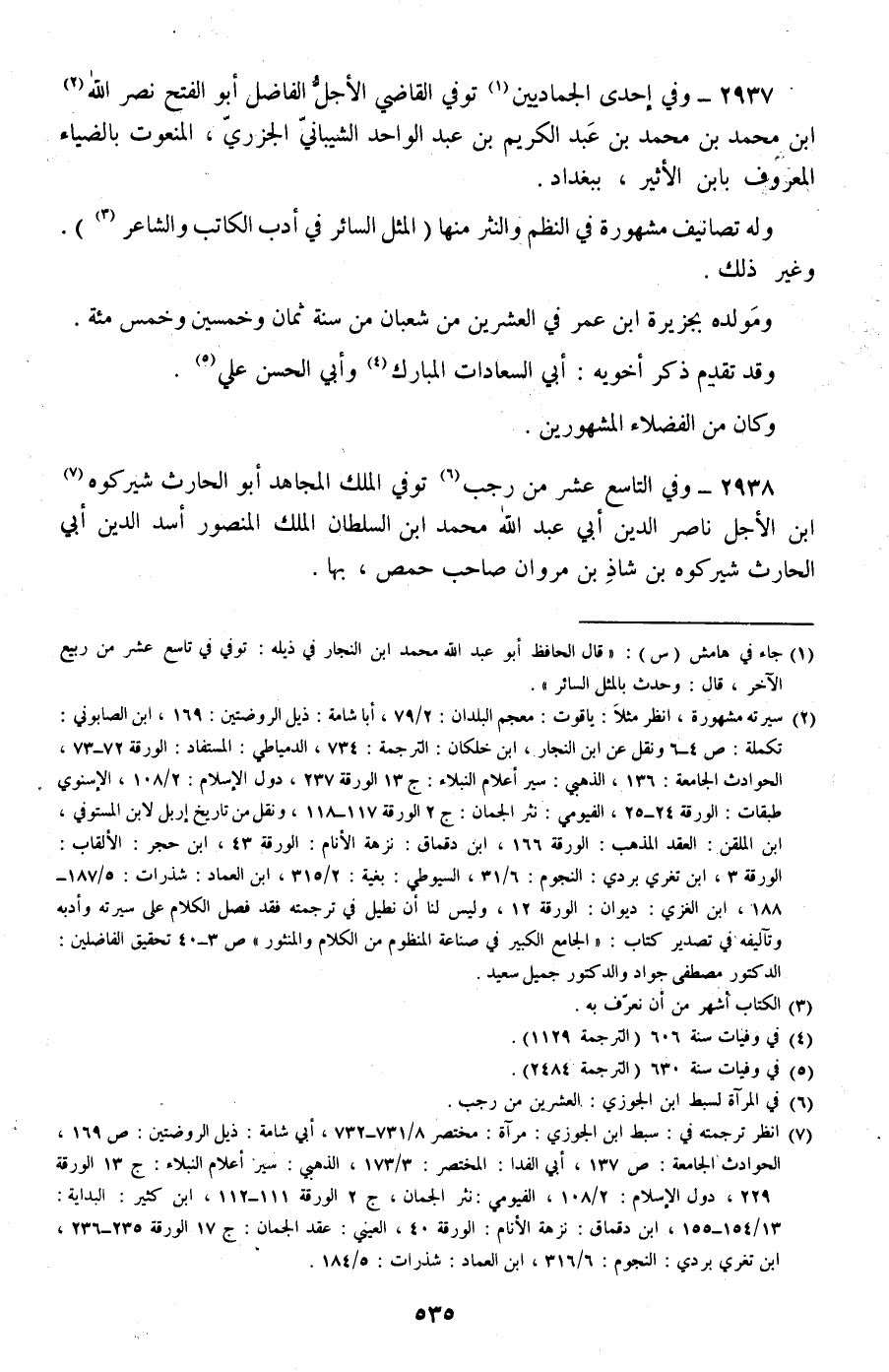 2937 - وفي إحدى الجماديين توفي القاضي الأجل الفاضل أبو الفتح نصر الله بن محمد بن محمد بن عبد الكريم بن عبد الواحد الشيباني الجزري، المنعوت بالضياء المعروف بابن الأثير، ببغداد.
