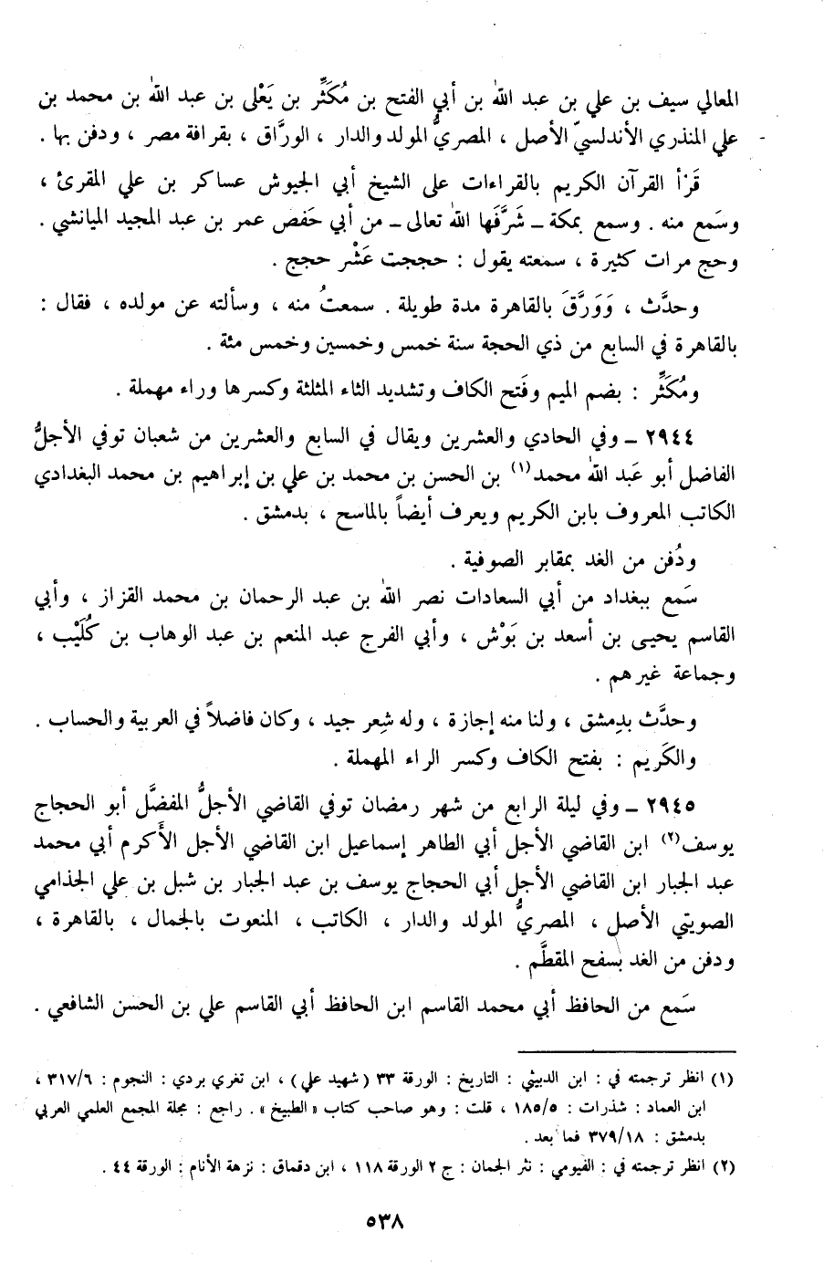 2944 - وفي الحادي والعشرين ويقال في السابع والعشرين من شعبان توفي الأجل الفاضل أبو عبد الله محمد بن الحسن بن محمد بن علي بن إبراهيم بن محمد البغدادي الكاتب المعروف بابن الكريم ويعرف أيضا بالماسح، بدمشق.