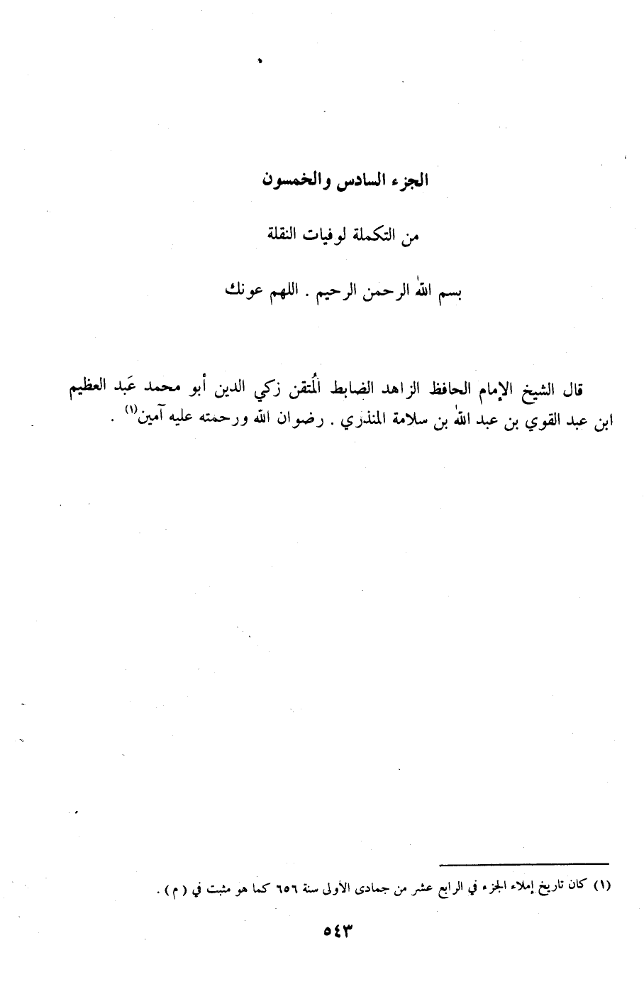 قال الشيخ الإمام الحافظ الزاهد الضابط المتقن زكي الدين أبو محمد عبد العظيم بن عبد القوي بن عبد الله بن سلامة المنذري -رضوان الله ورحمته عليه آمين.