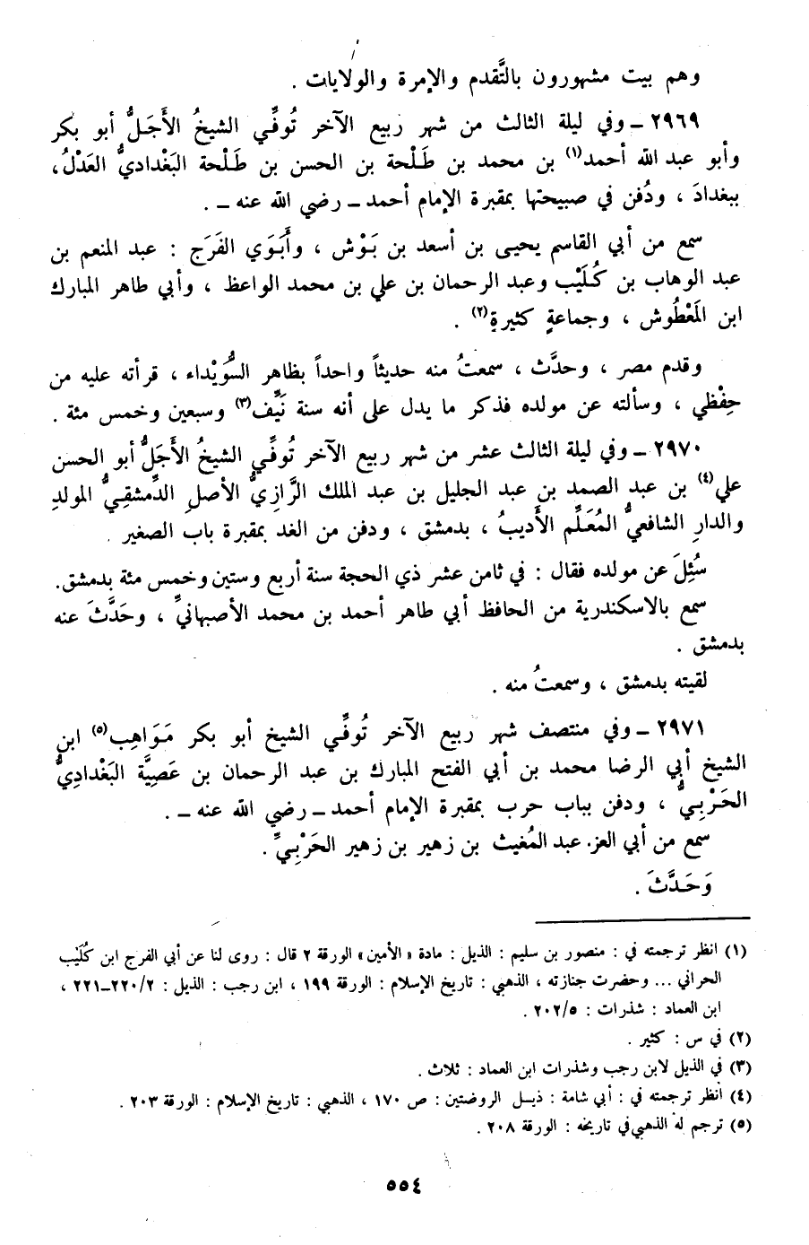 2969 - وفي ليلة الثالث من شهر ربيع الآخر توفي الشيخ الأجل أبو بكر وأبو عبد الله أحمد بن محمد بن طلحة بن الحسن بن طلحة البغدادي العدل، ببغداد، ودفن في صبيحتها بمقبرة الإمام أحمد -رضي الله عنه-.