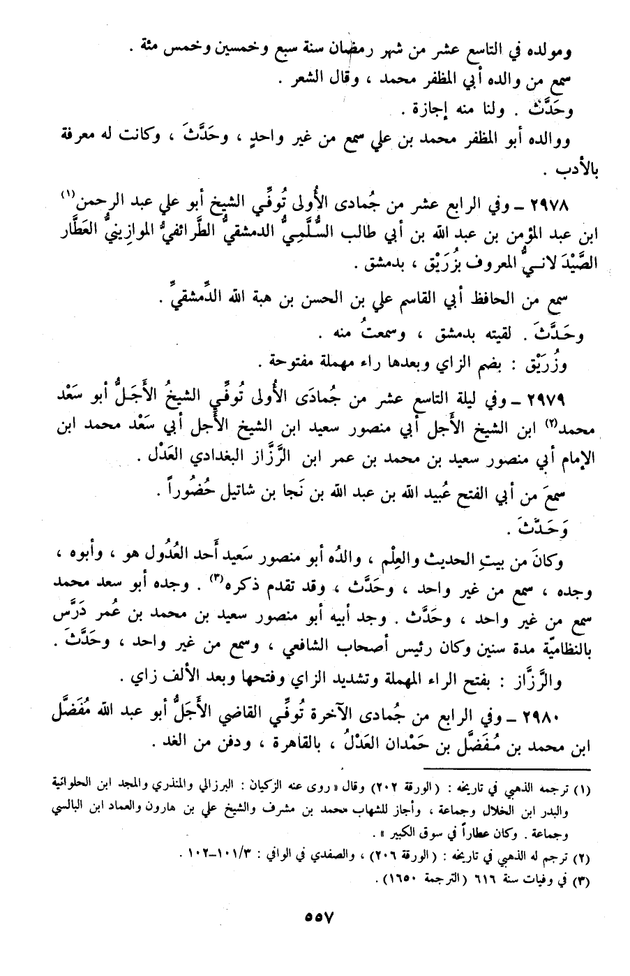 2979 - وفي ليلة التاسع عشر من جمادى الأولى توفي الشيخ الأجل أبو سعد محمد ابن الشيخ الأجل أبي منصور سعيد ابن الشيخ الأجل أبي سعد محمد ابن الإمام أبي منصور سعيد بن محمد بن عمر ابن الرزاز البغدادي العدل