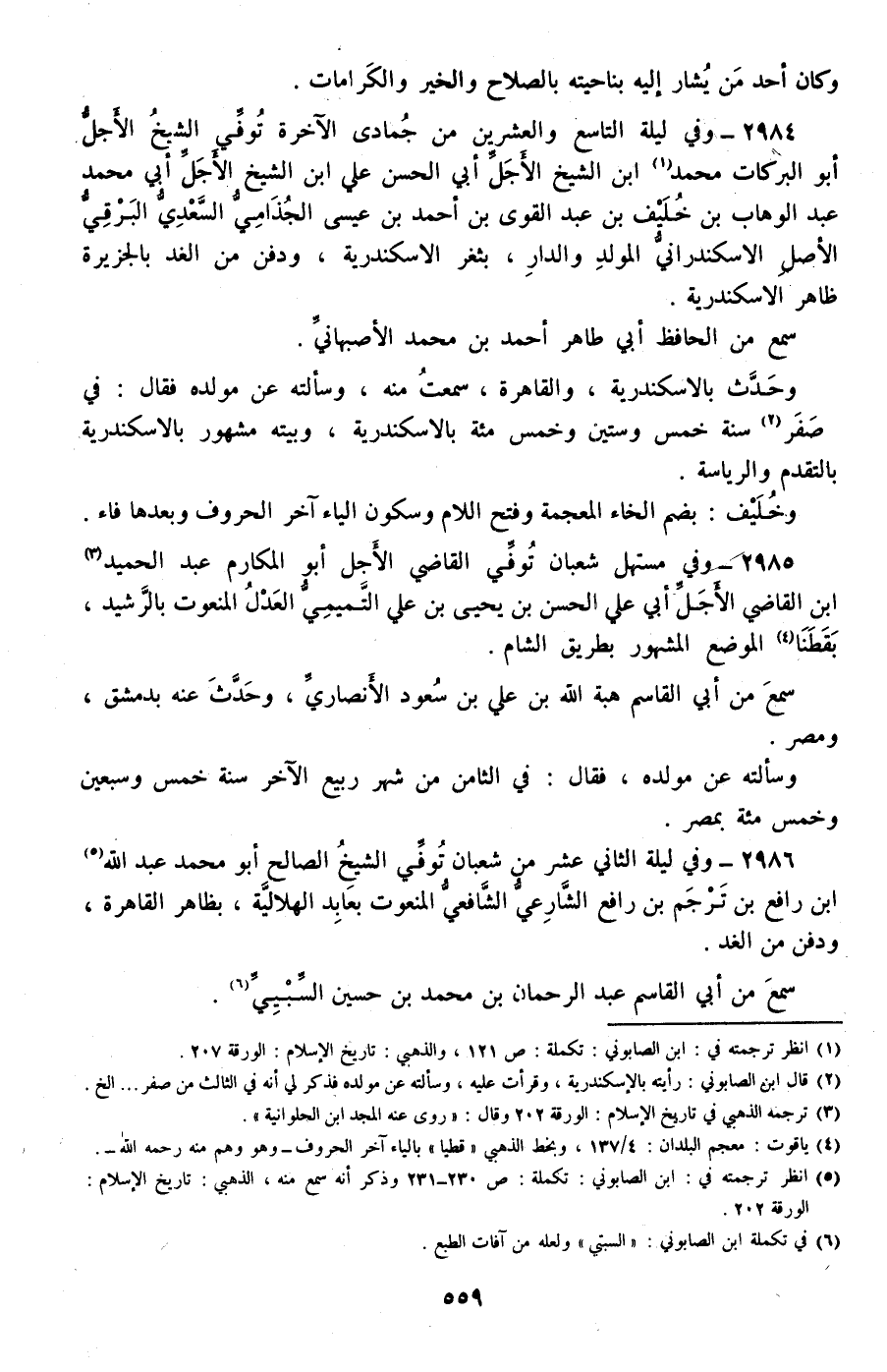 2984 - وفي ليلة التاسع والعشرين من جمادى الآخرة توفي الشيخ الأجل أبو البركات محمد ابن الشيخ الأجل أبي الحسن علي ابن الشيخ الأجل أبي محمد عبد الوهاب بن خليف بن عبد القوي بن أحمد بن عيسى الجذامي السعدي البرقي الأصل الإسكندراني المولد والدار، بثغر الإسكندرية، ودفن من الغد بالجزيرة ظاهر الإسكندرية.