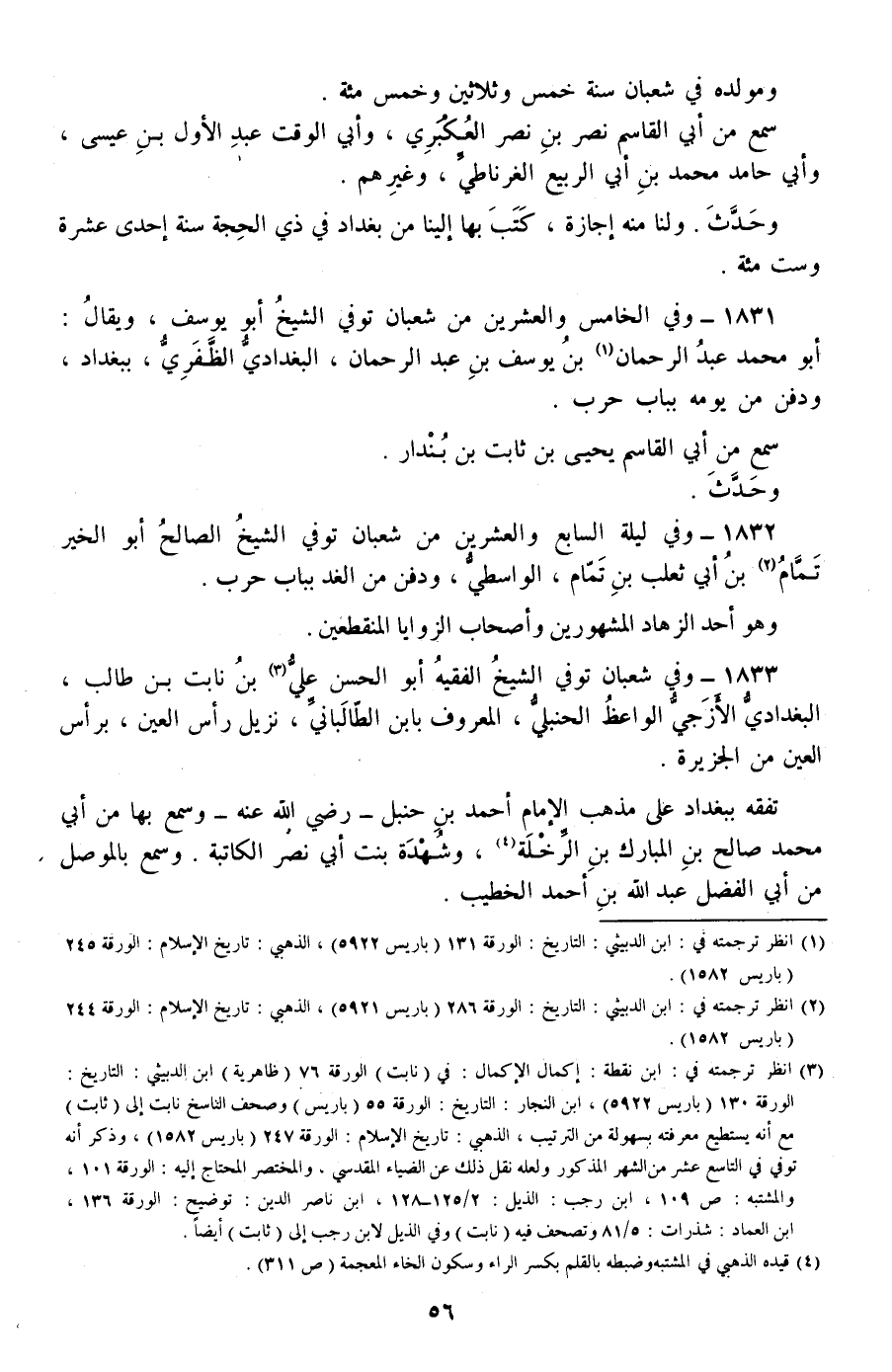1831 - وفي الخامس والعشرين من شعبان توفي الشيخ أبو يوسف، ويقال: أبو محمد عبد الرحمان بن يوسف بن عبد الرحمان، البغدادي الظفري، ببغداد، ودفن من يومه بباب حرب.