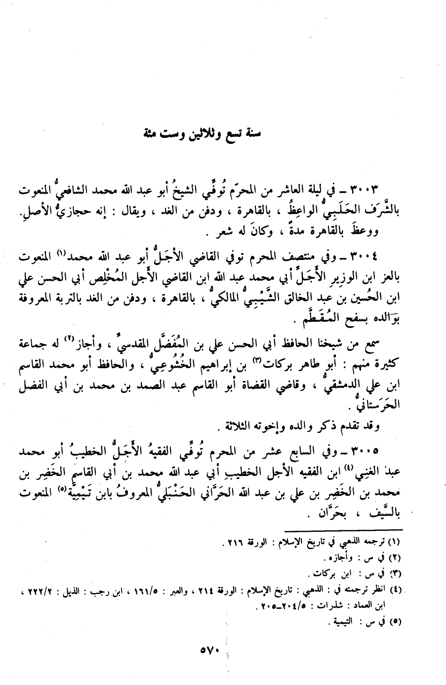 3005 - وفي السابع عشر من المحرم توفي الفقيه الأجل الخطيب أبو محمد عبد الغني ابن الفقيه الأجل الخطيب أبي عبد الله محمد بن أبي القاسم الخضر بن محمد بن الخضر بن علي بن عبد الله الحراني الحنبلي المعروف بابن تيمية المنعوت بالسيف، بحران.