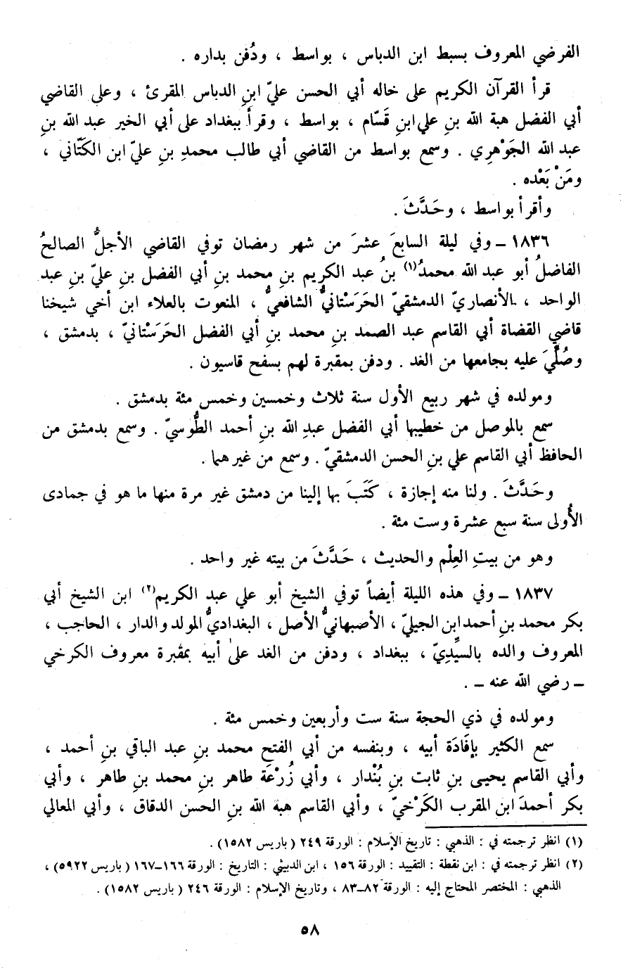 1836 - وفي ليلة السابع عشر من شهر رمضان توفي القاضي الأجل الصالح الفاضل أبو عبد الله محمد بن عبد الكريم بن محمد بن أبي الفضل بن علي بن عبد الواحد، الأنصاري الدمشقي الحرستاني الشافعي المنعوت بالعلاء ابن أخي شيخنا قاضي القضاة أبي القاسم عبد الصمد بن محمد بن أبي الفضل الحرستاني، بدمشق، وصلي عليه بجامعها من الغد. ودفن بمقبرة لهم بسفح قاسيون.